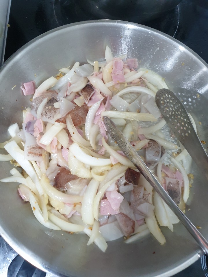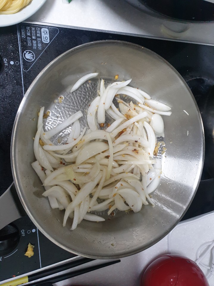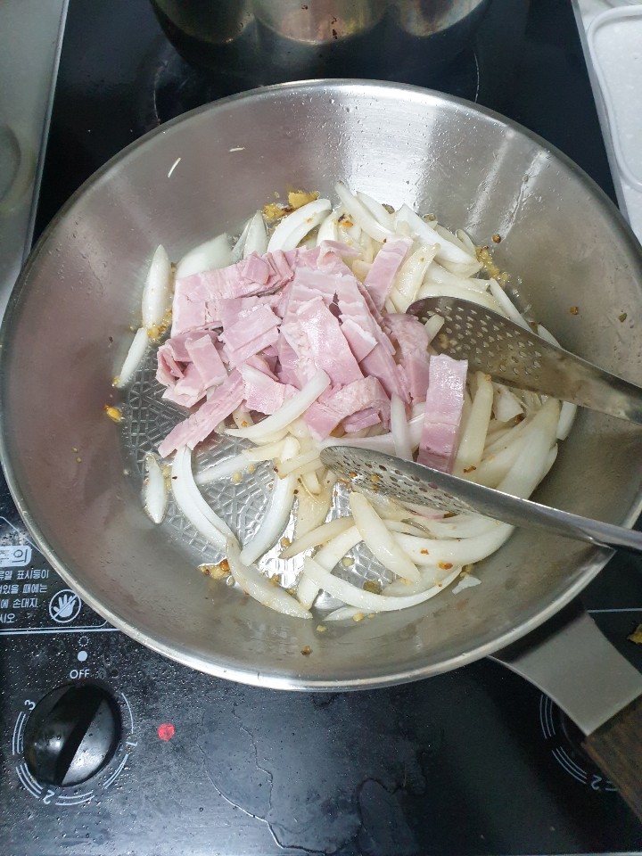 네 기름을 골고루 펴준것 같으면 양파와 마늘을 넣어 볶아줍시다.