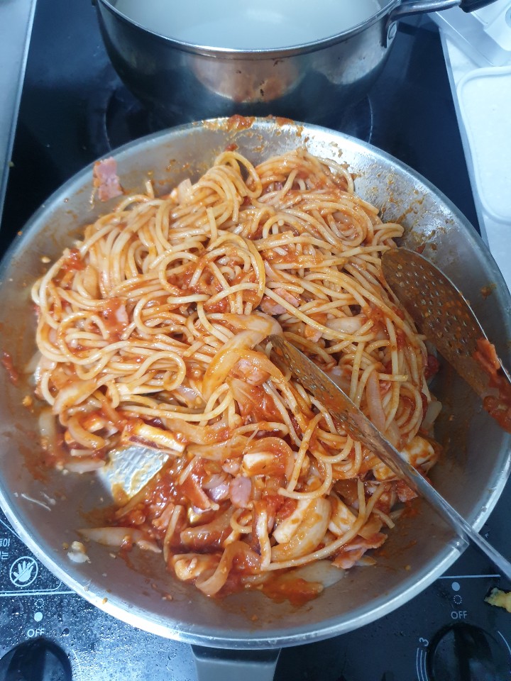 사실 토마토 소스를 샀기에 여기다 그대로뿌리면 완성이라 볼 수 있는것 아닌가 싶습니다.