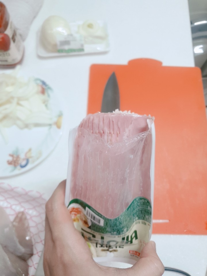 이렇게 자르는게맞는지 모르겠는데 약간 베이컨처럼 썰어줬습니다. 길까봐 한번씩 잘라주고요