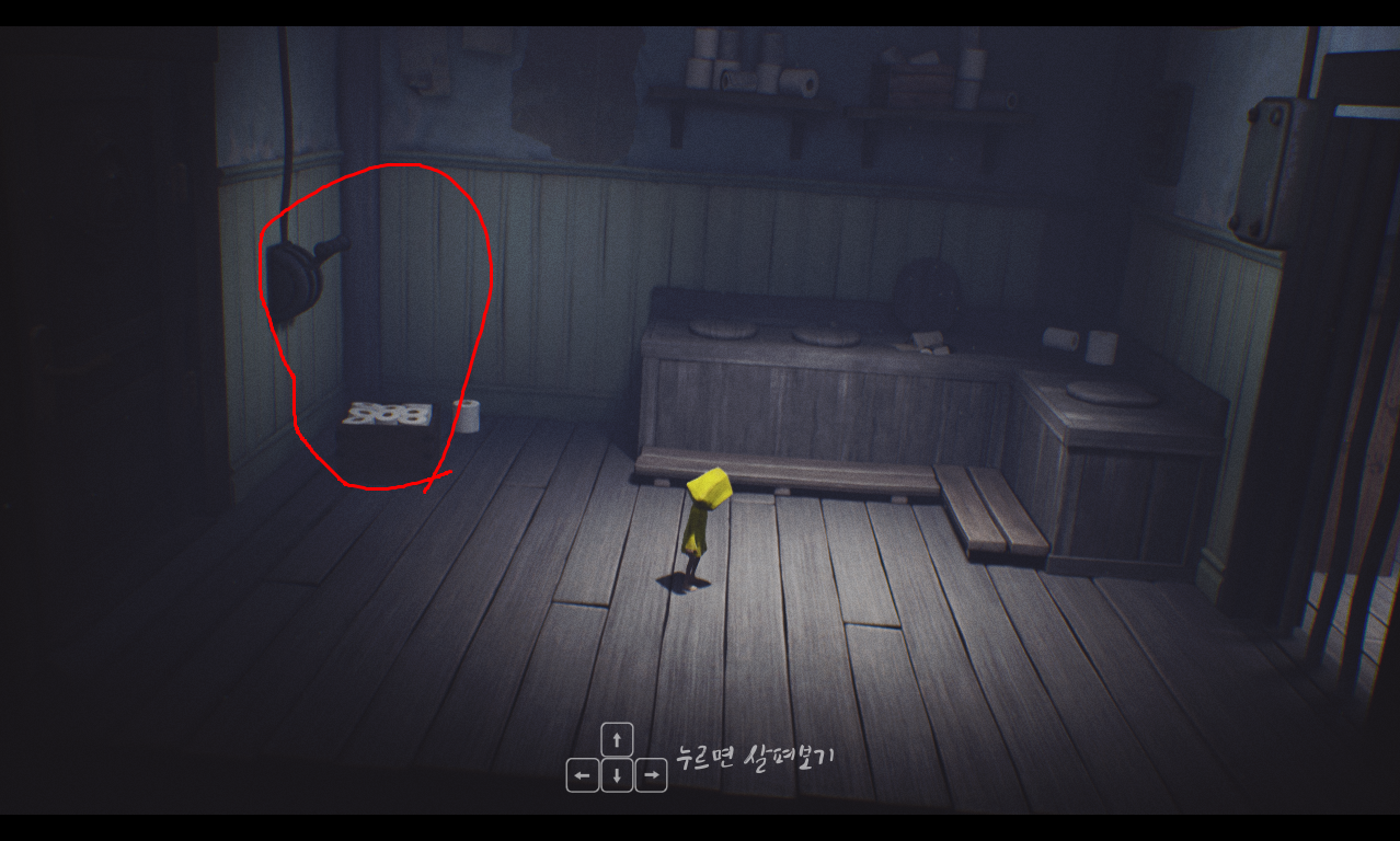 왼쪽 문 뒤에있는 레버를 당겨줍시다. 휴지박스를 발판으로 사용하면됩니다.