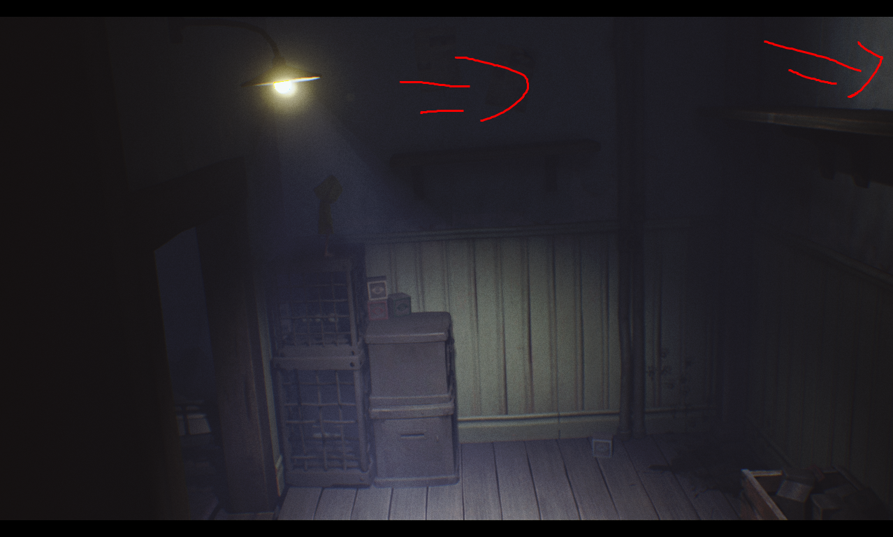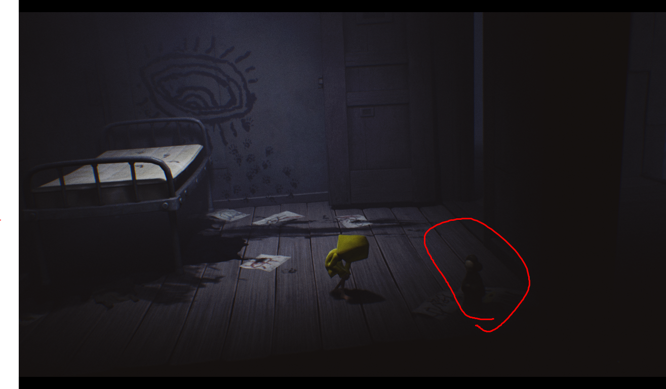 제목이 리틀 나이트 메어라는 점과 그런 분위기를 연출하는 방 문이 열려있으며 안에 사람이 없습니다.